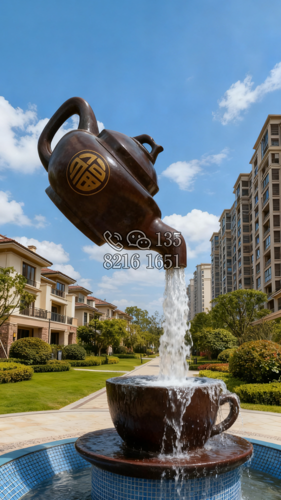 玻璃鋼材質(zhì),仿陶罐,大型流水景觀雕塑。總高6米,頂部陶罐長(zhǎng)1.26米,中間主體陶罐高4.1米,去除底部一圈陶罐和外部飄帶造型,內(nèi)置水管水泵,水被抽入頂部陶罐,再?gòu)奶展蘅诹舫?,形成水流源源不斷永遠(yuǎn)流不完的錯(cuò)覺。